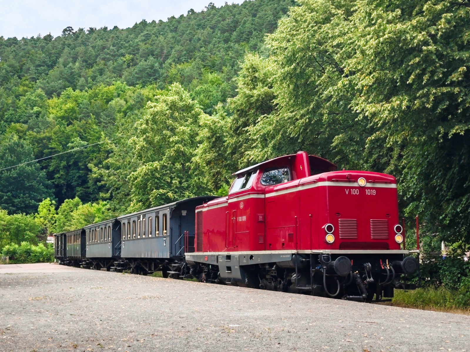 Sonderzug des Kuckucksbähnels in Elmstein mit der V 100 1019 der UEF