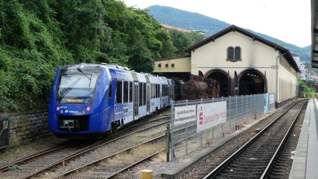 Ein moderner Triebwagen zu Besuch im Eisenbahnmuseum Neustadt. Im Hintergrund die Dampflokomotive bad. Xb