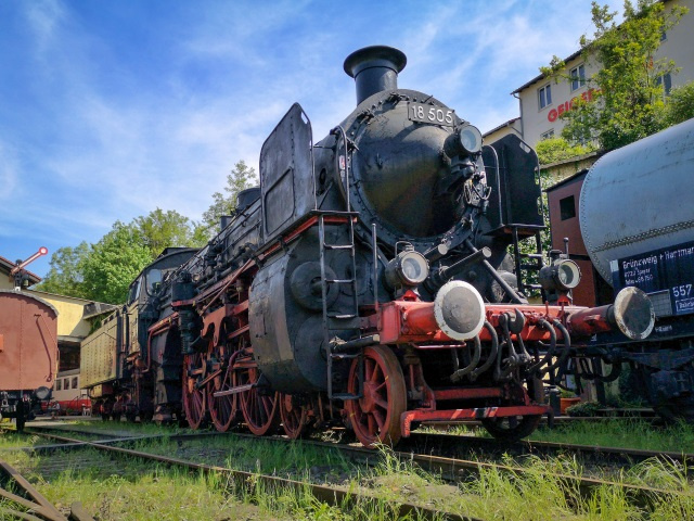 Unsere Schnellzugdampflok 18 505 (bayr. S 3/6) vor dem Museumsgebäude. Normalerweise steht die Lok in der Halle, wenn der Platz in der Halle für eine Veranstaltung benötigt wird, darf die Lok auch mal die Halle verlassen.